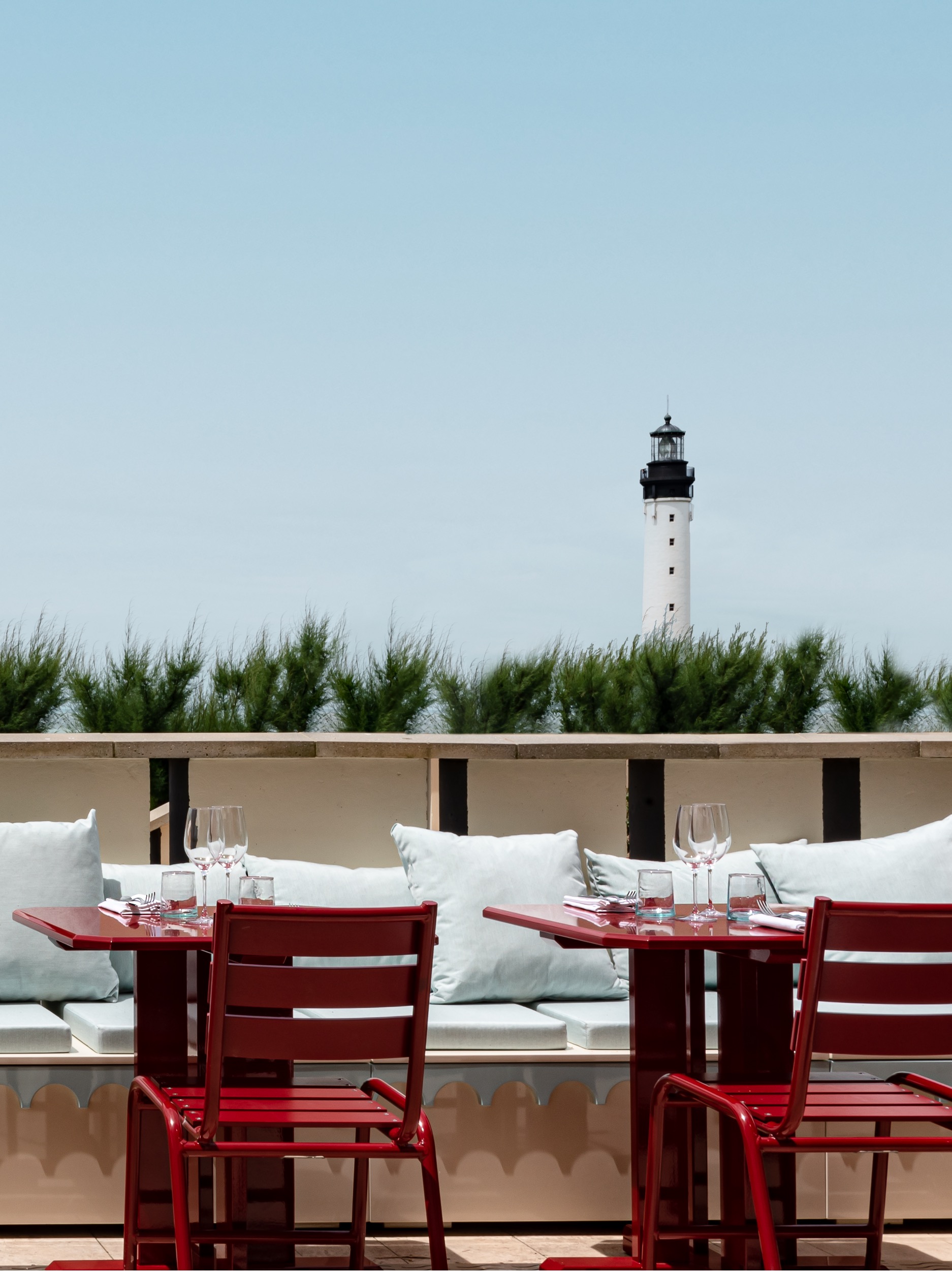 There are 72 rooms and suites, many with views of the Atlantic or the Biarritz Golf Course. Rooms are simple but thoughtful in design—clean lines, soft textures, and vintage-inspired furniture. Some have balconies, and family rooms are available. Bathrooms are modern and stocked with curated amenities. Frenchie Biarritz, the in-house restaurant, serves inventive takes on brasserie classics—steak tartare, roasted local fish, fresh vegetables, and daily specials.